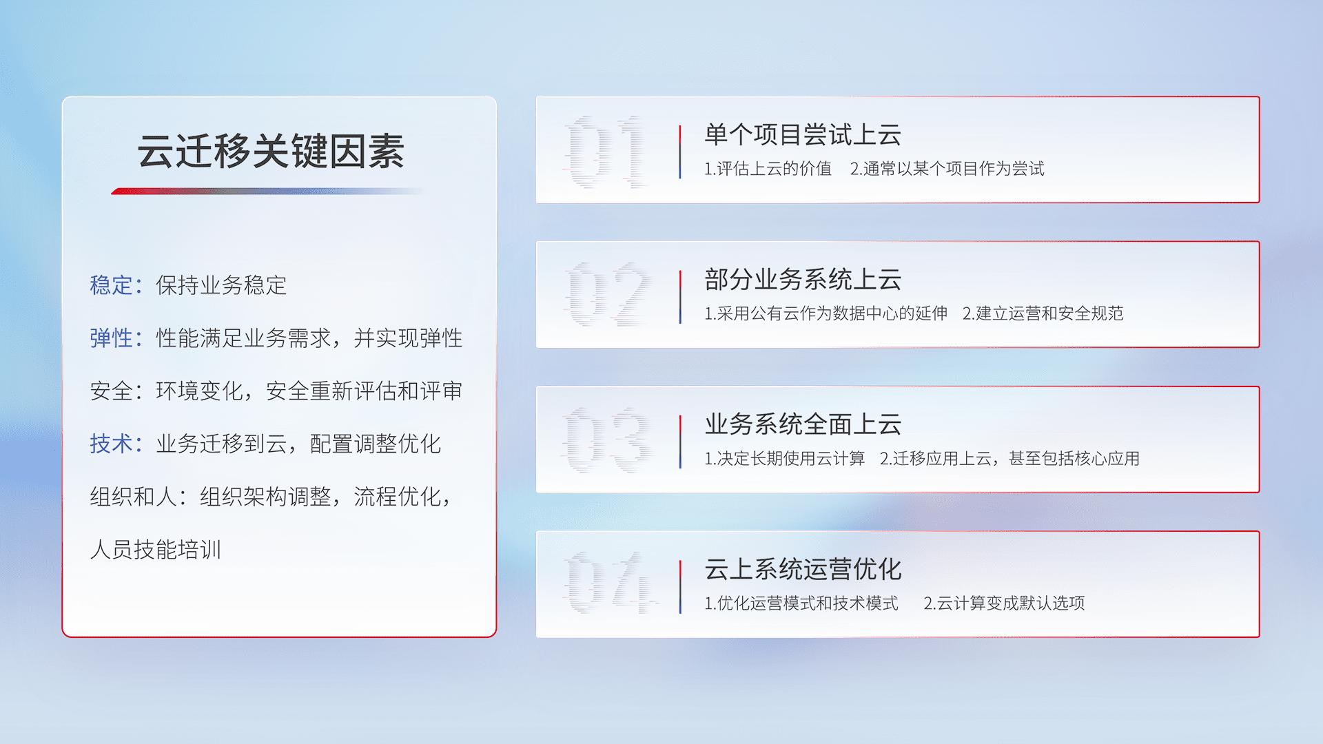 结合实际业务,,从规划设计、、、、云平台选型、、、云原生改造、、数据迁移、、集成交付,,,,迁移全过程为客户识别最佳上云路径,,做好风险识别管理,,设计网络架构、、、、身份权限、、、、安全审计合规、、操作审计、、、、日志审计、、、、监控告警策略、、多站点容灾设计等,,,,对云上基础设施进行整体规划,,提升IT治理水平,,,以满足弹性、、高可用、、、、高性能的需求。。。