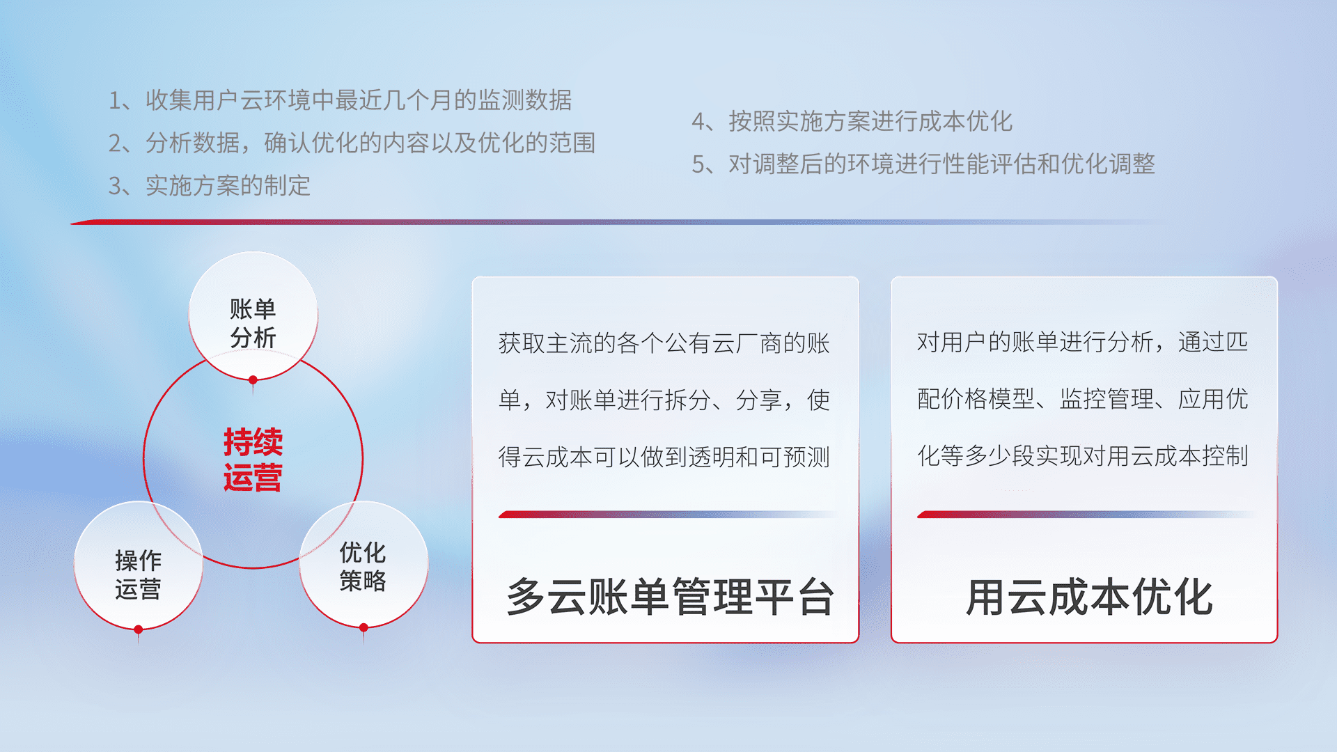 通过多云纳管,,,,以统一的资源数据模型把客户的云资源进行抽象和封装,,进而实现对多云资源的统一操作,,,保障云资源管理的可靠性、、、、稳定性与可用性。。量身定制化运维内容,,,,配置、、、、开发运维、、补丁管理、、、备份、、、、监控、、认证和访问管理、、审计和日常巡检等,,,保障在用云过程中的可靠度,,稳定度以及高可用率。。。